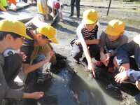 源泉では、ぶくぶくしている水やお湯溜まりに手を入れて、温度を感じたり肌のつやの変化に驚いていました。10円玉を入れて、色の変化を注意深く見ている児童もたくさんいました。