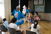 太鼓の体験では、腰に太鼓を付けて、保存会方のお手本を見ながら力強く太鼓を鳴らしました。「同じように叩けたよ!」「1つだけズレちゃったなぁ」と口々に感想を話し、独特なリズムを味わうことができた様子でした。