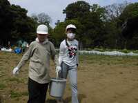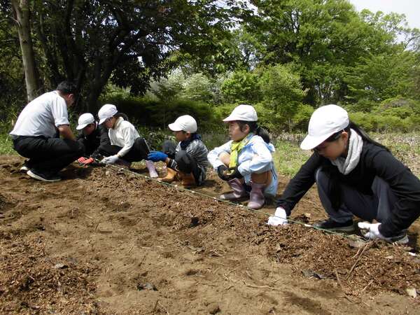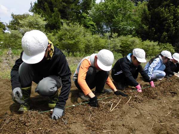 みんなで畑に到着すると、耕されている畑に堆肥を蒔き、めもりにそって子芋を優しく植えました。